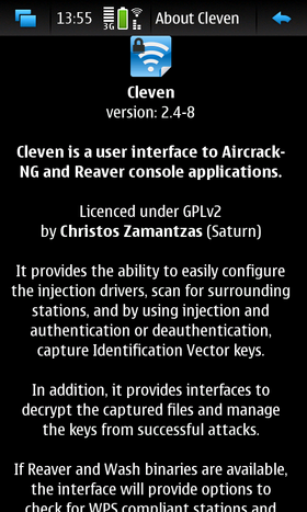 The Cleven application is a user interface to the aircrack-ng for the N900 device.