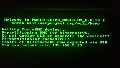 - Keep the device plugged. What happens next is that the N9 is being repartitioned for Nemo (on the device, you will see some green text/writing on the screen; just wait for it to finish) , you'll see the led blinking for 10min or so.