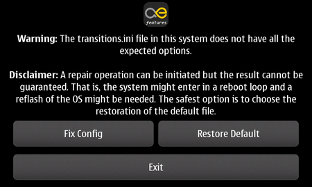 Note: This will restore to the shipped version of the transitions.ini and will not have any effect on the similar file in /etc/hildon/theme/ that might be used by theming.