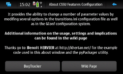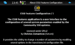 It provides the ability to change a number of parameters in the transitions.ini configuration file as well as the relevant GConf entries' values. The options are described in the Community SSU/Features wiki page. Additional information on the usage, settings and implications could be found below.